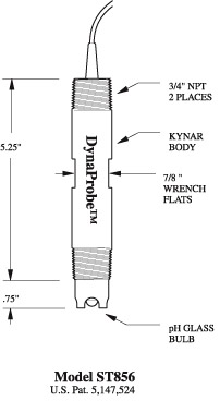 The ST856 is a rugged, sealed sensor assembly designed for in-line or submersion applications. The patented solid state reference cell features the unique IonTrap™ design for extended service life in the most severe applications. The body, with an integral 3/4″ MNPT insertion thread, is moulded from chemically resistant Kynar and the reference junction is porous Teflon. Built-in temperature compensators are available. Features include built-in sensor guard that protects the sensor tip from impact. Sensor also available in ORP (Redox) version.