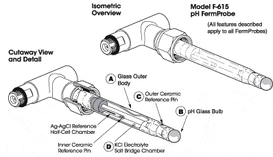 Fermprobe pH electrodes exhibit a fairly predictable “lifetime vs. temperature” performance ratio. The higher the temperature, the shorter the life; and, the longer the duration of exposure to elevated temperature, the shorter the life. Maximum temperature advisable is 135°C.