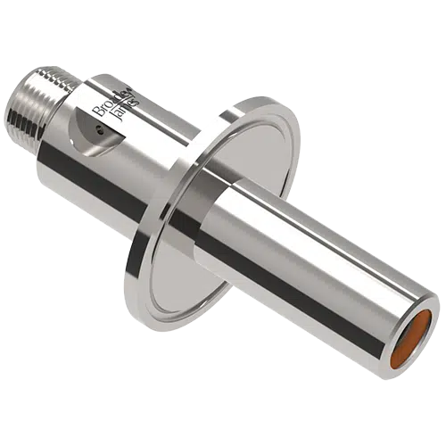 Sometimes found on vessels in biotech facilities, this style of port is flush to the vessel wall to minimize crevices. The unique design of the port offers increased drainage around the port and more effective Clean-In-Place (CIP). The NA-connect® port from NovAseptic is compatible with a special sanitary housing, which is secured to the port by a clamp. The port is installed at a 15° angle to allow for proper electrode performance. See the cutaway drawing to the right for typical installation dimensions.