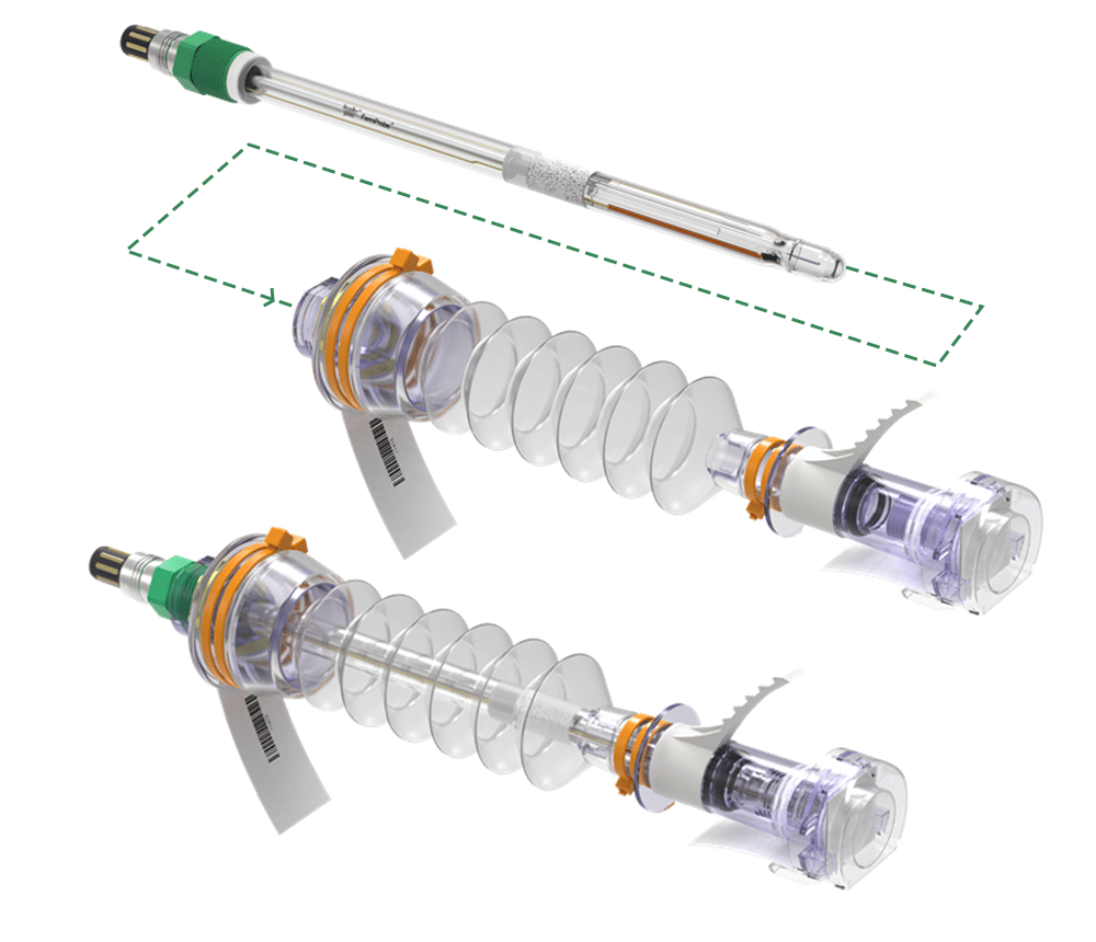The Model SG310 is a gamma irradiated single-use pH sensor and bellows insertion assembly equipped with a Kleenpak® connector for aseptic attachment to a bioprocess container (BPC). The entire SG310 assembly is assembled and double bagged in an ISO 7 cleanroom prior to gamma irradiation. Enables the operator to quickly connect the pH sensor assembly to the BPC and aseptically insert the sensor into the media. Saves operator time and reduces risk of error.