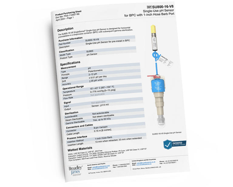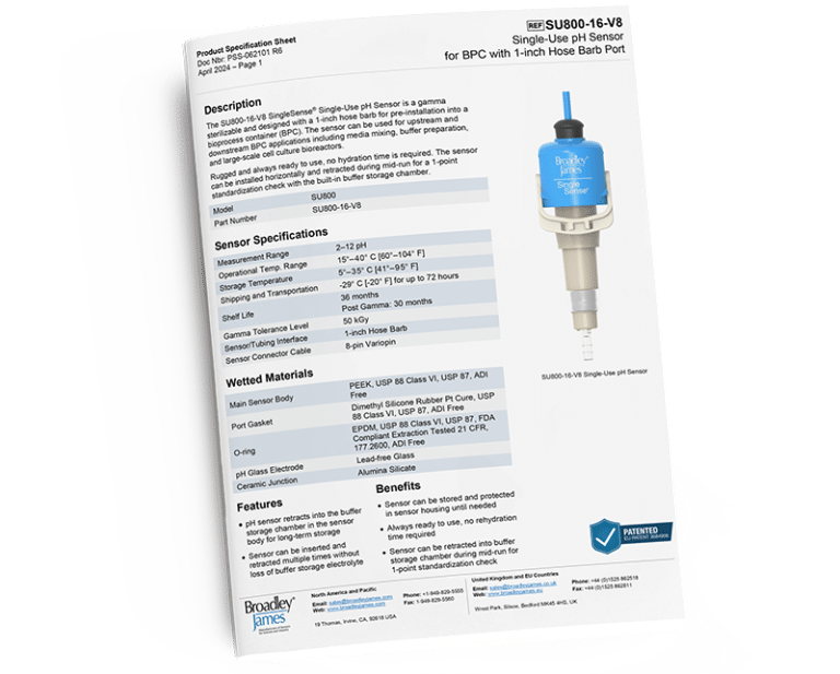 The SU800-16 SingleSense® Single-Use pH Sensor is gamma sterilizable and designed with a 1-inch hose barb for preinstallation into a bioprocess container (BPC). The sensor can be used for upstream and downstream BPC applications including media mixing, buffer preparation, and large-scale cell culture bioreactors.